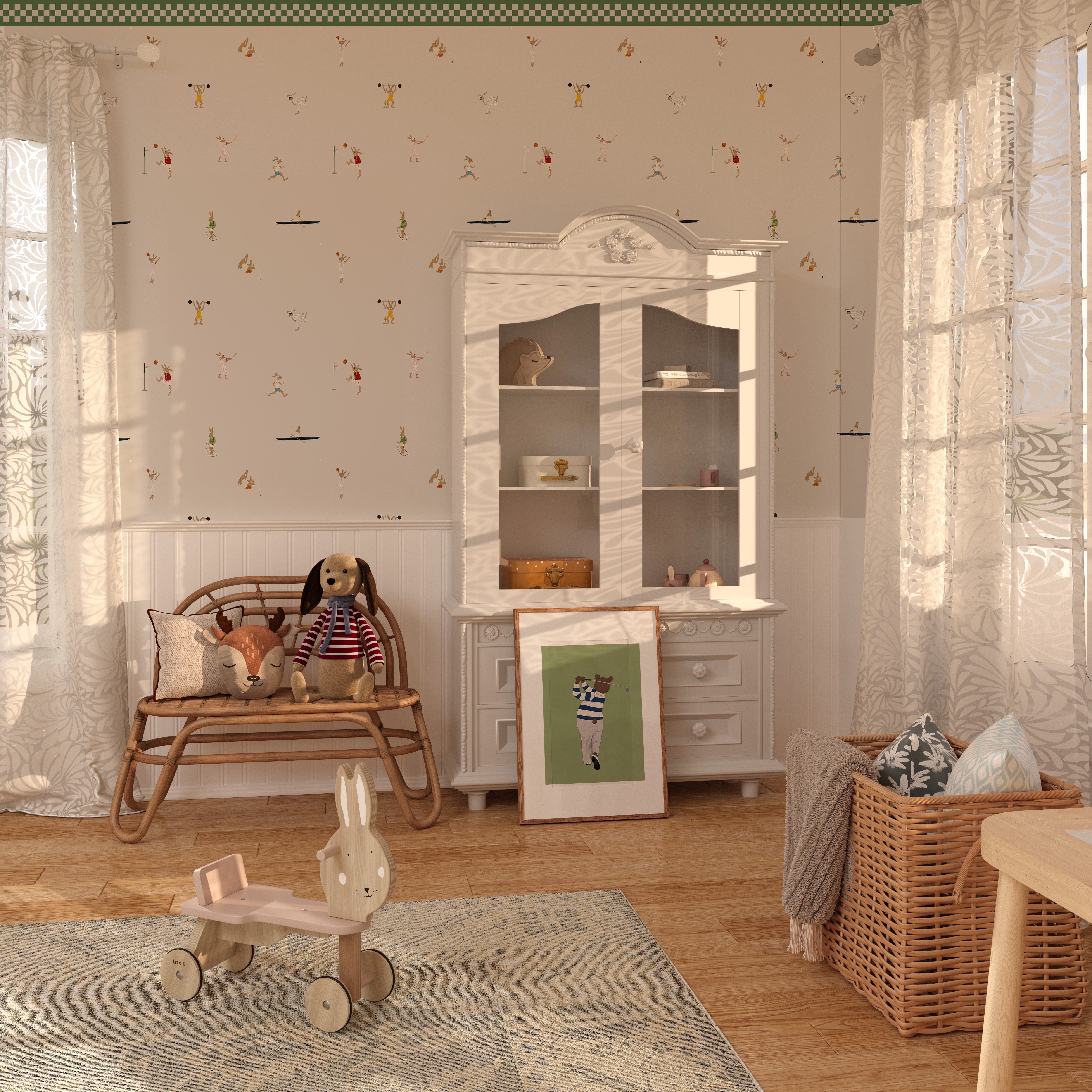 Most colors are matched with our matte non-woven wallpapers, but we can also do custom colors on request. This one matches perfectly with the sports bunnies green.